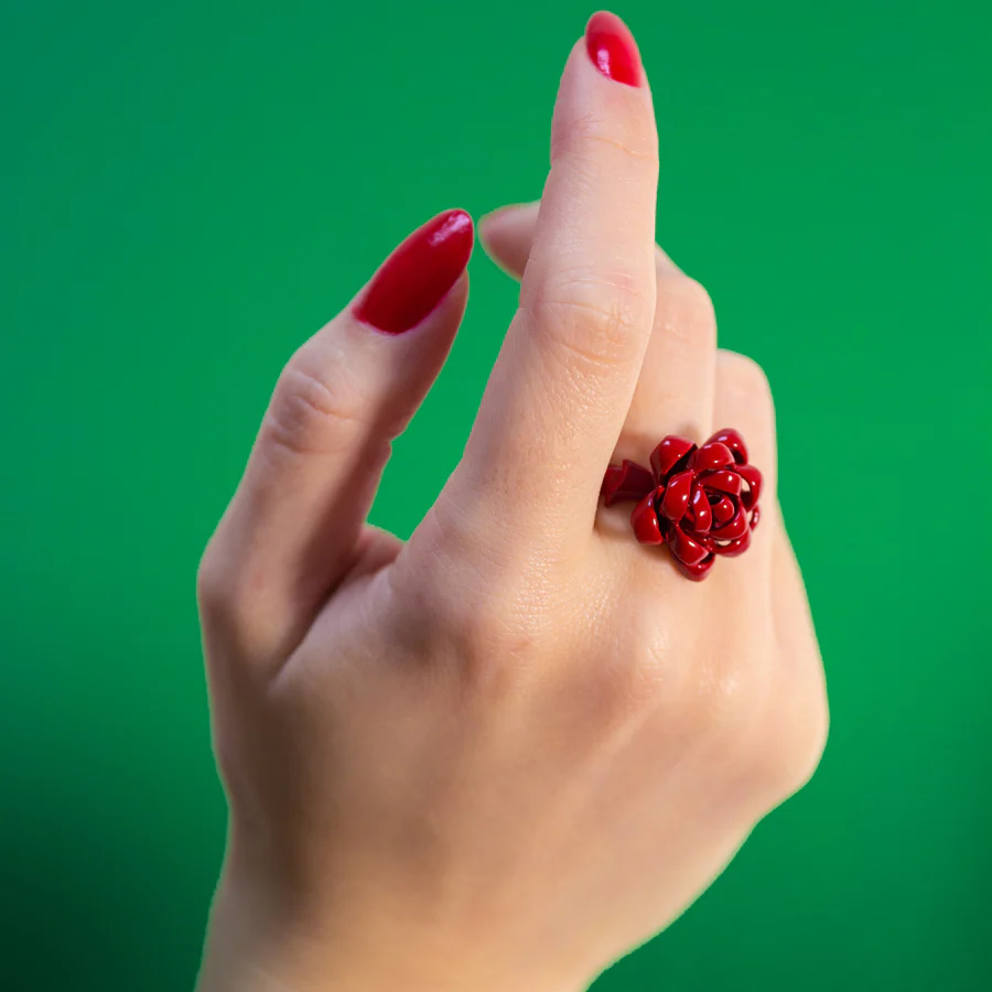 Glossy red enamel on a sterling silver ribbon shaped ring